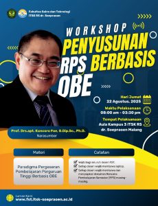 Halo, tenaga pendidik Fakultas Sains dan Teknologi ITSK RS dr. Soepraoen! Mari hadiri kegiatan ‘Workshop Penyusunan RPS Berbasis OBE’ bersama Prof. Drs.apt. Kuncoro Foe, G.Dip.Sc., Ph.D. pada: